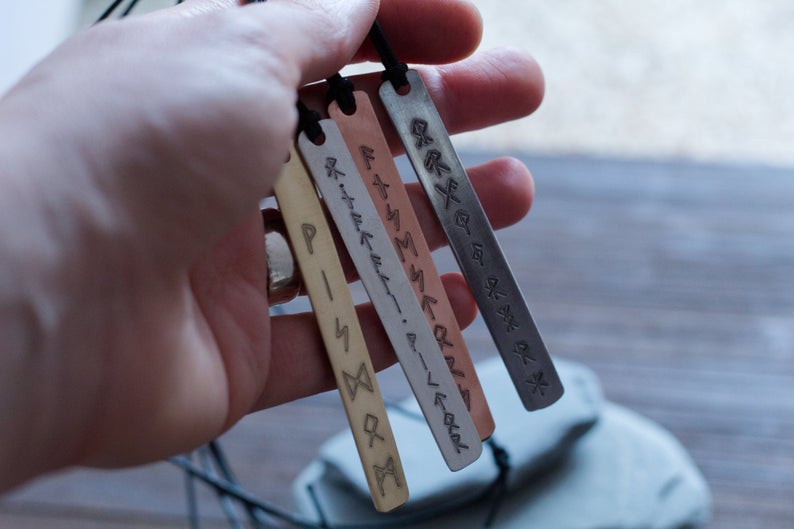 This Rune pendant is expertly handcrafted in your choice of solid fine silver, aluminum, copper or brass. Each Rune is meticulously stamped one at a time and then given a mirror polish. Pendant rests on a black cotton cord.