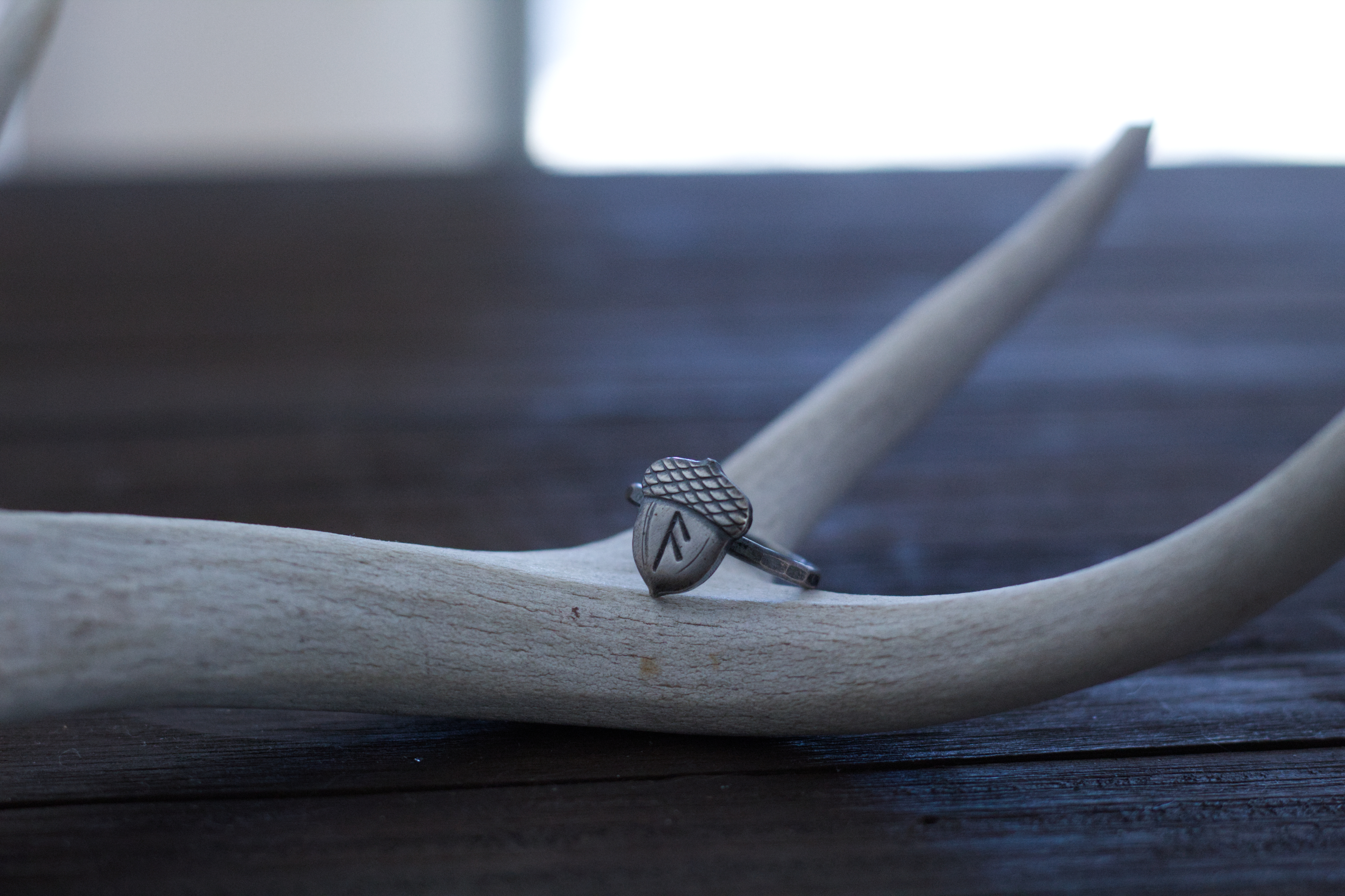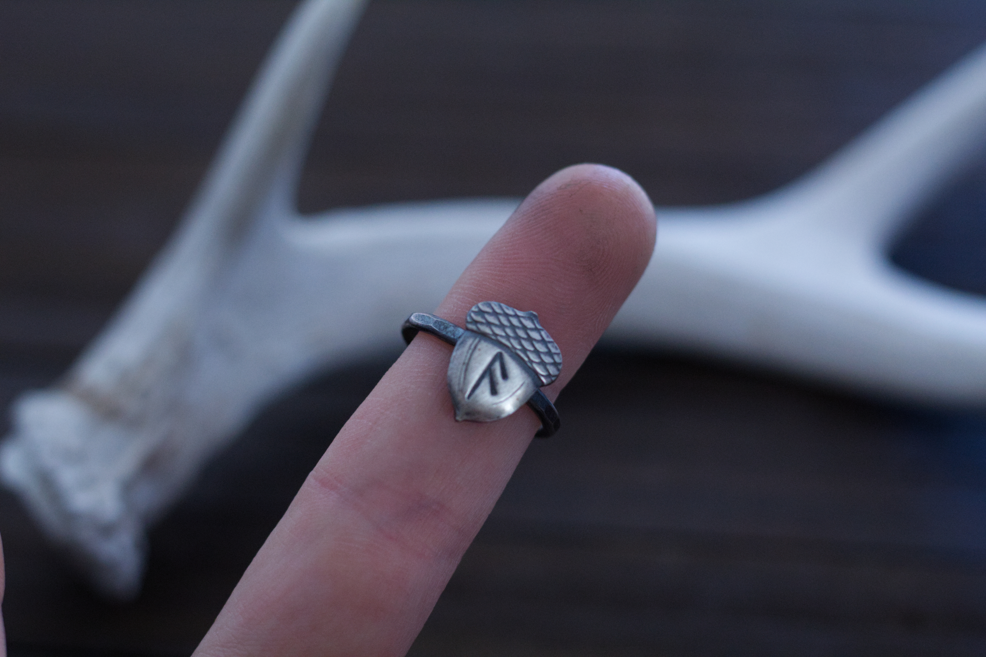 Fully handcrafted Acorn ring with your choice of Elder Futhark Rune (Ansuz shown). The acorn is forged in solid fine silver and rests on a sterling silver ring base and the overall piece has a blackened finish.