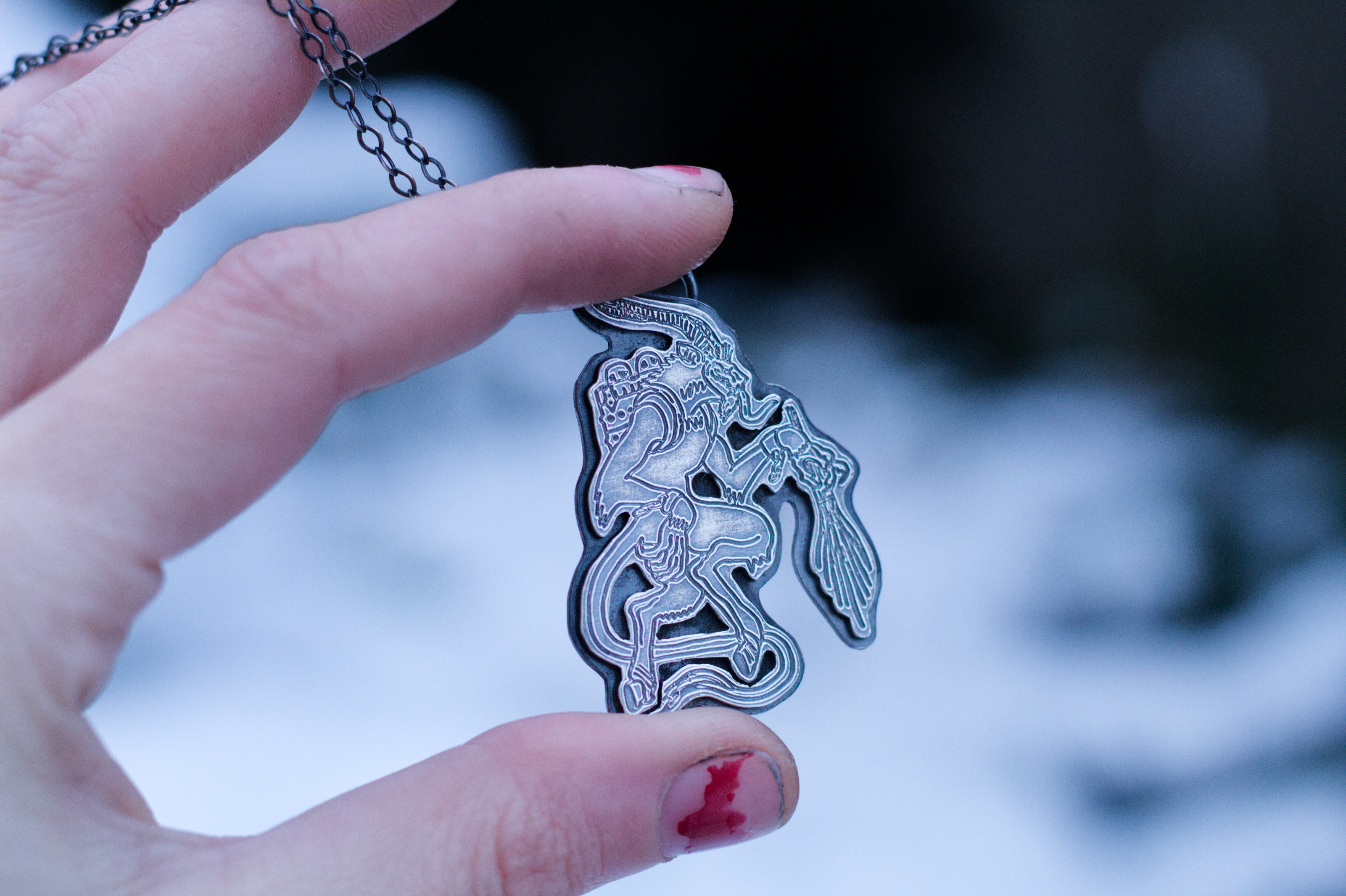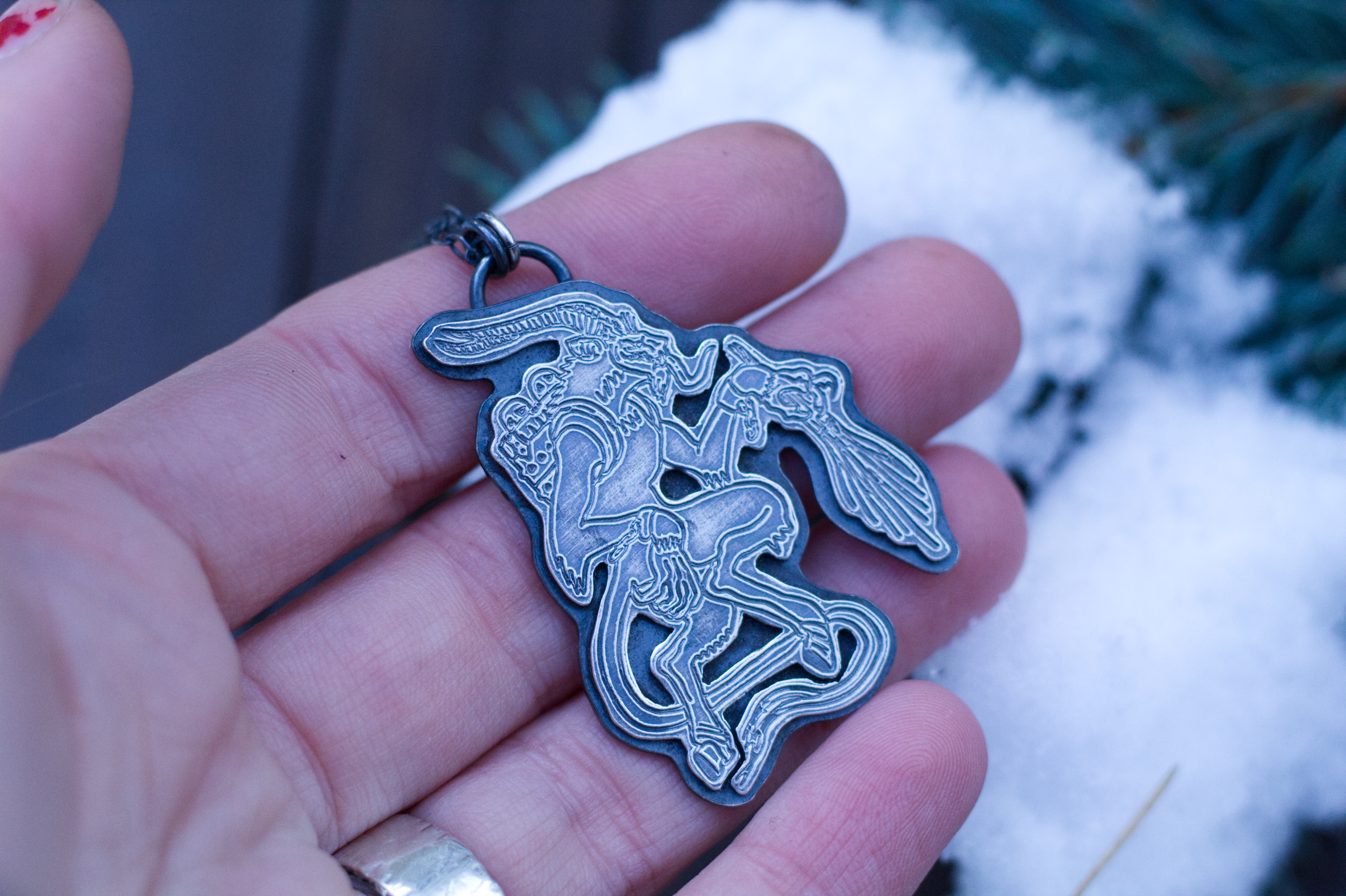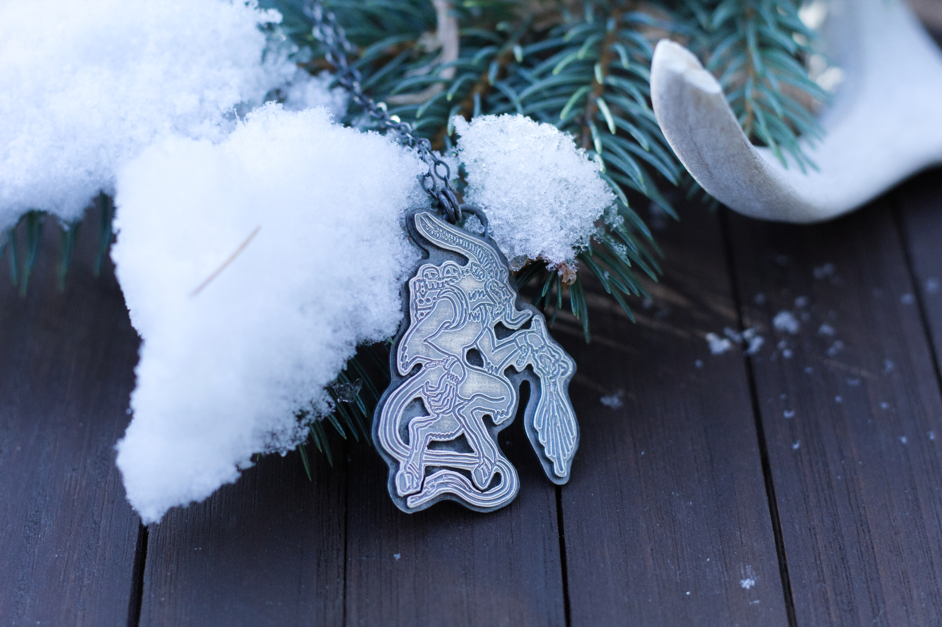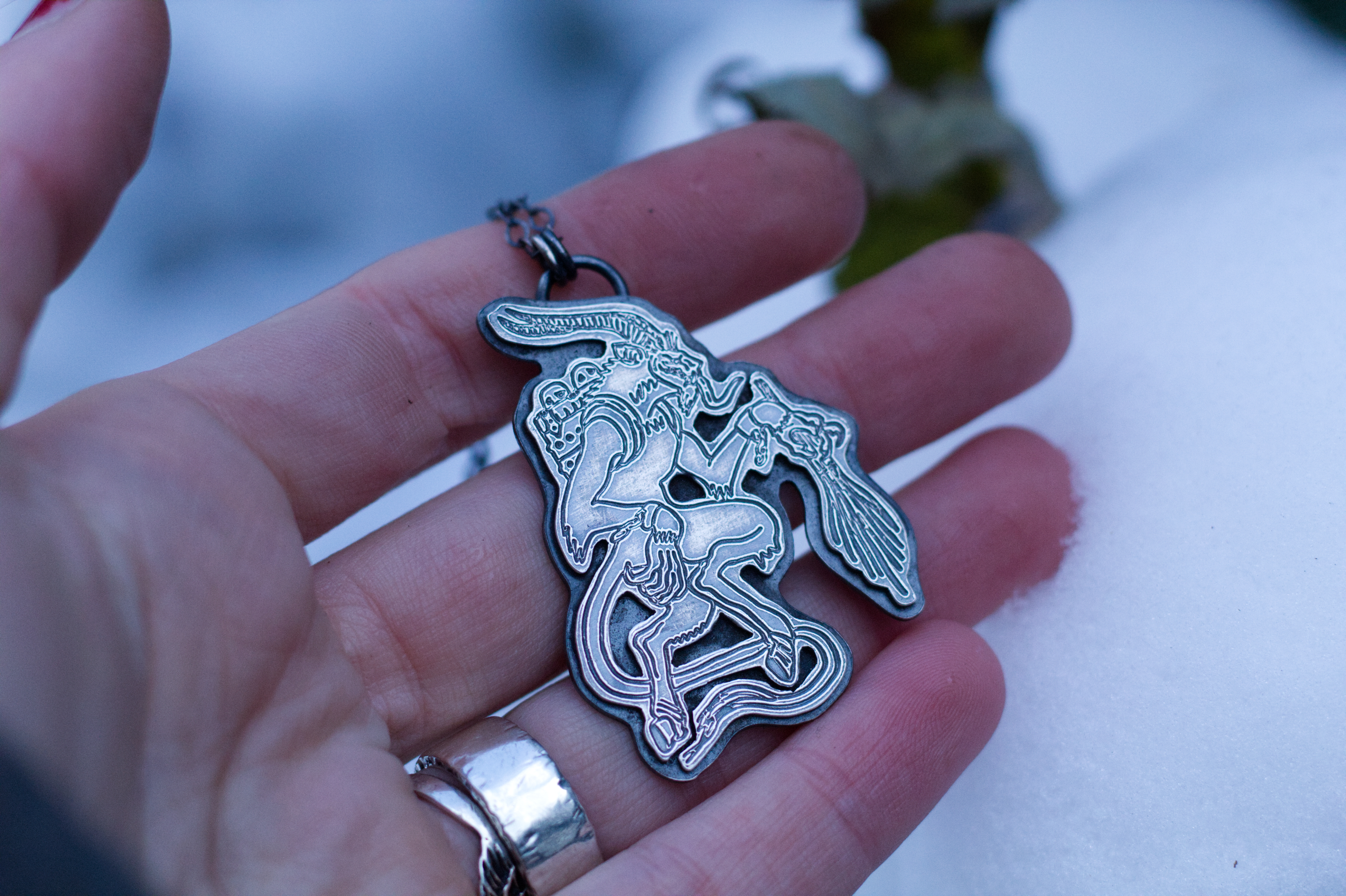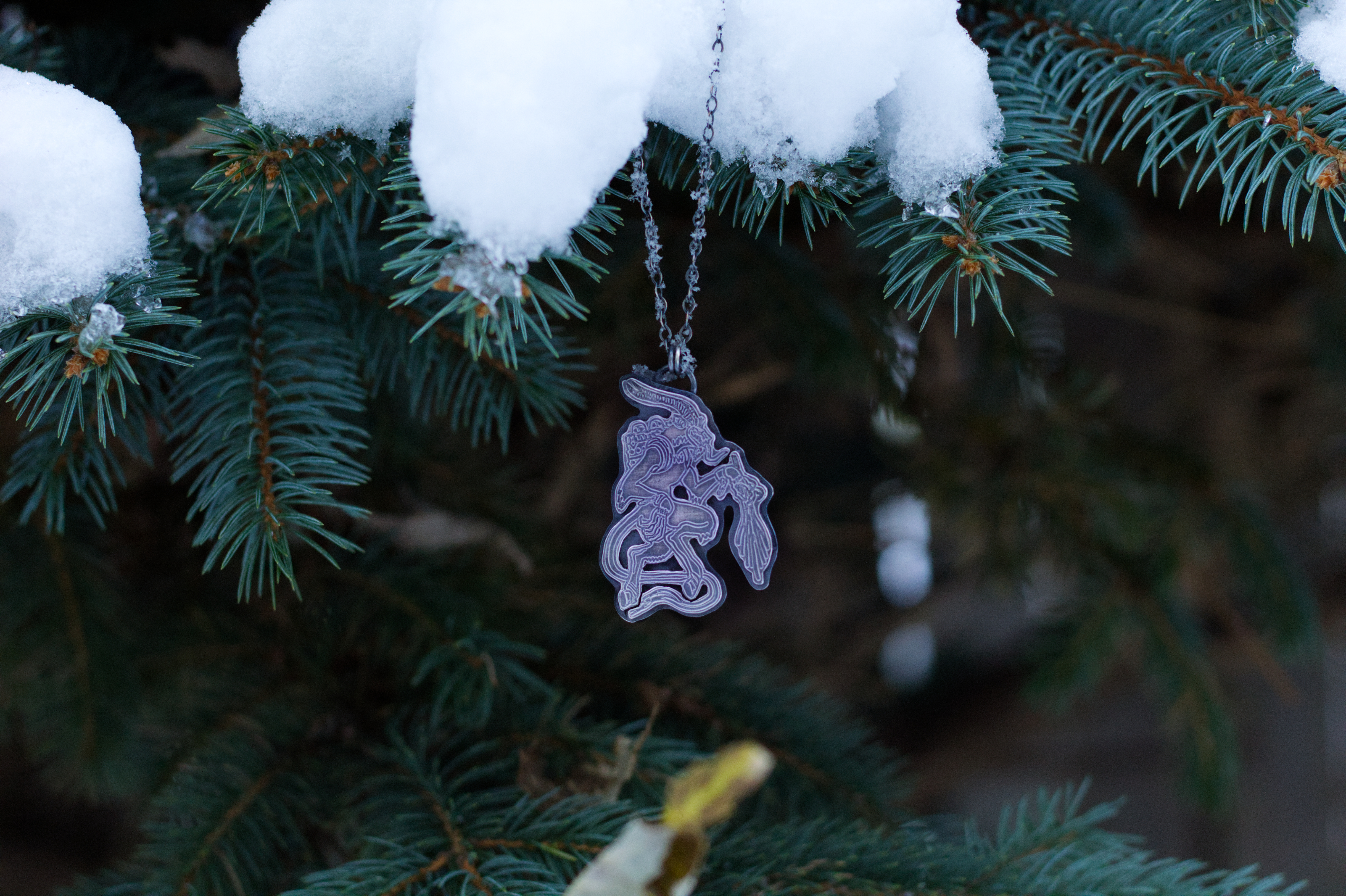 This pendant is a tribute to the Bavarian Krampus / Perchten during the darkest times of the year, the infamous Rauhnächte. It was during these sacred nights that smoke was burned and the spirits of Wotans Wild Hunt, Wotan’s wilde Jagd, roamed the ice landscape of the European Alps. The Krampus is an old Archetype of alpine, animistic and pagan folklore of bavarian and austrian heritage. It stems from a belief so ancient and old, of Berchta, who is the equivalent to the norse Hel, of her dark and mystic Underworld, and the spirit realm that could be found here and now, within nature and within ourselves.