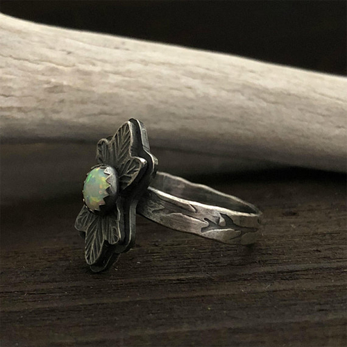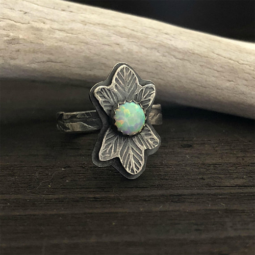 An irresistible take on a woodland leaves and simulated opal ring – fully handcrafted in solid fine and sterling silver. Rustic branches are stamped onto the hammered texture ring band and features a rustic, blackened finish.
