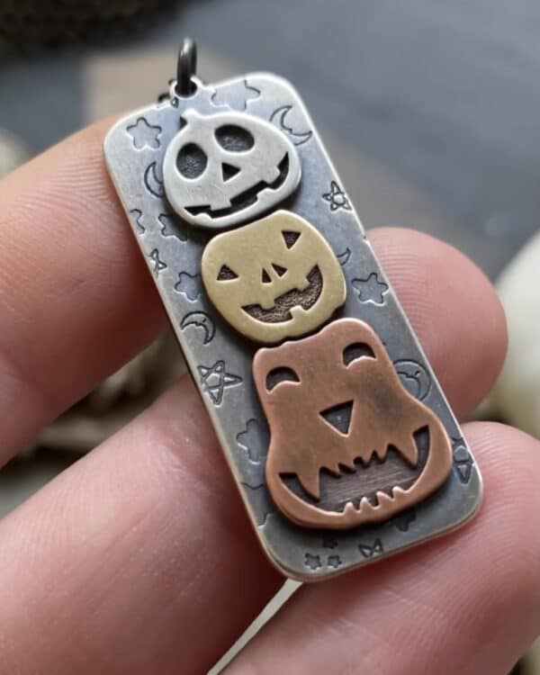 3 adorable mixed metal Jack O’ lanterns are stacked on top of each other, featuring a moon and star background.