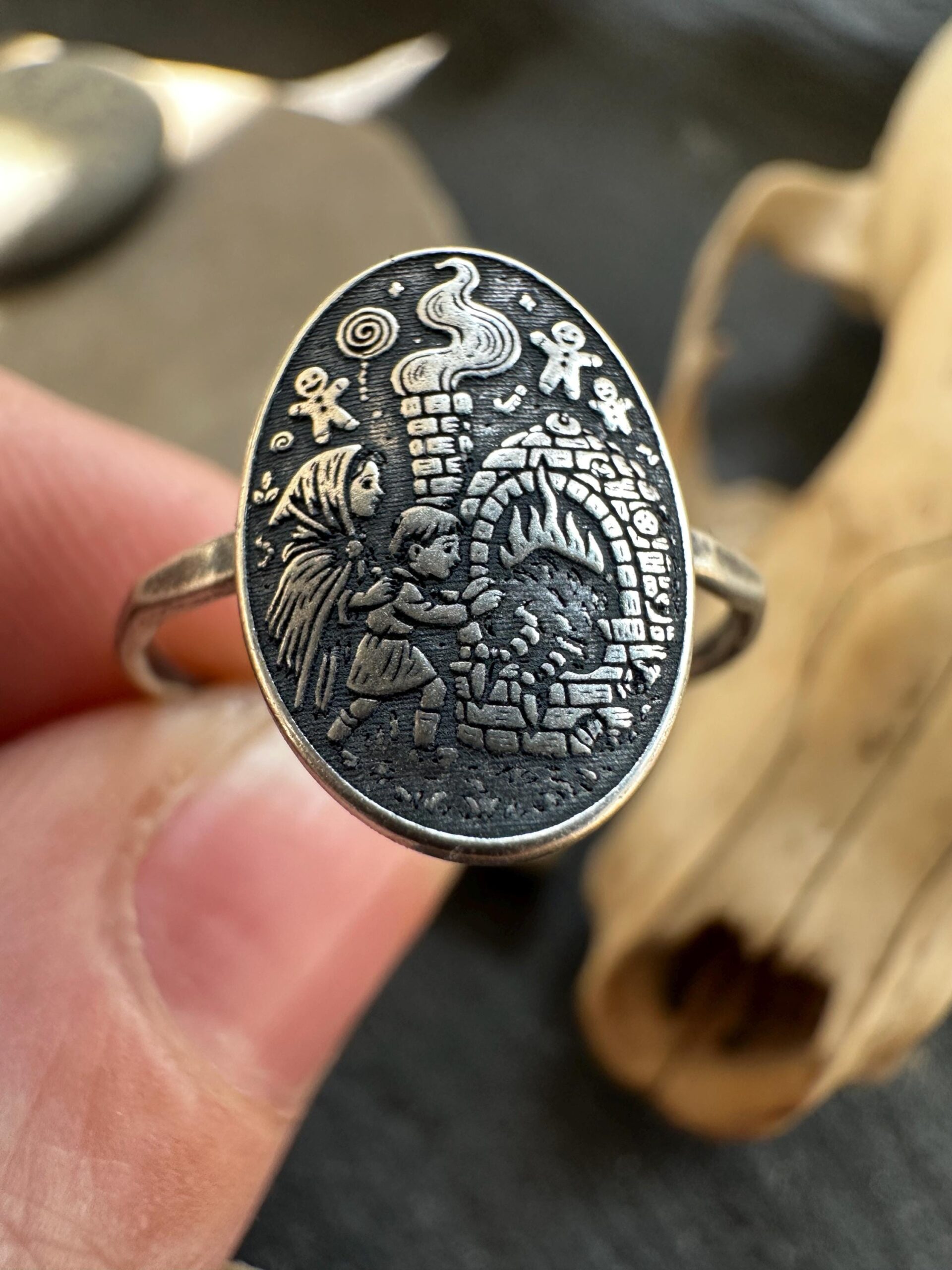 The design shows the unforgettable moment when the children push the witch into the oven, making it a striking storybook ring for collectors and lovers of folklore.