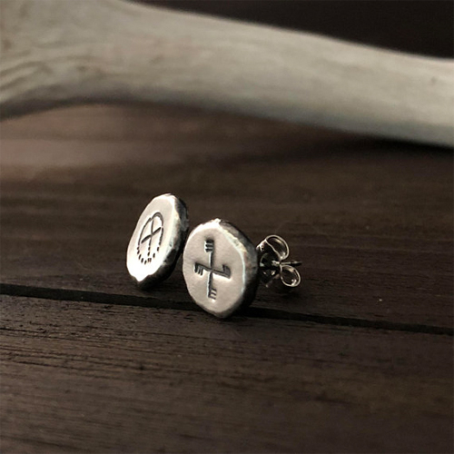 These Vinca symbols earrings are great for both men and women. Solid fine silver is melted down – then forged flat with a hammer, giving it an organic shape which adds to the individuality of each creation. Ear posts and nuts in sterling silver and topped off with a blackened finish for a rustic aesthetic.