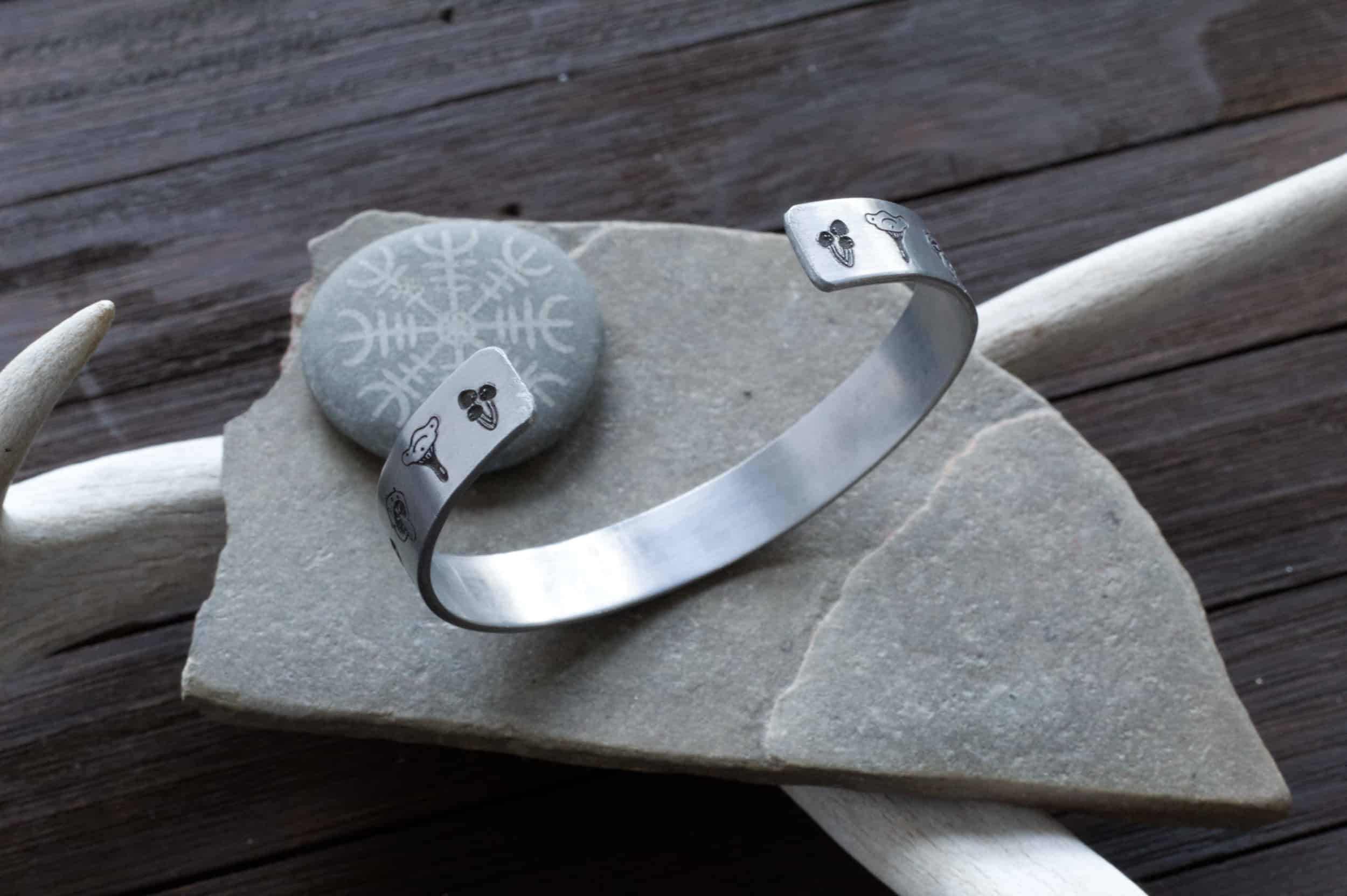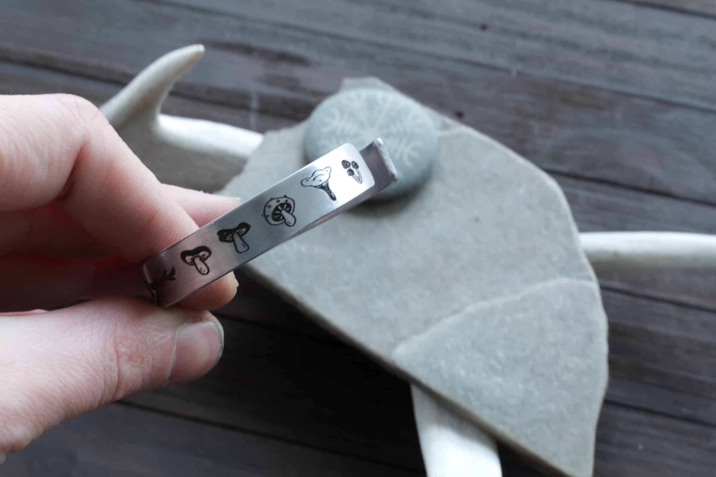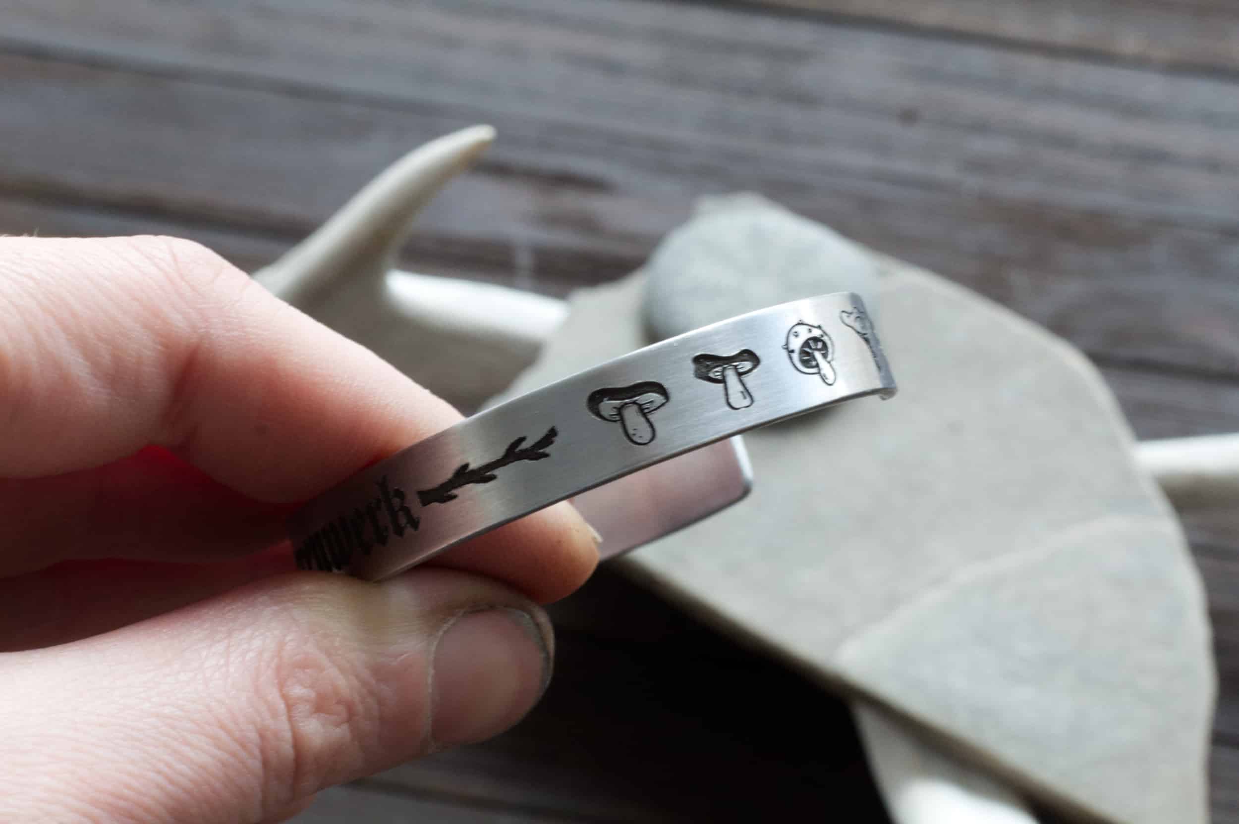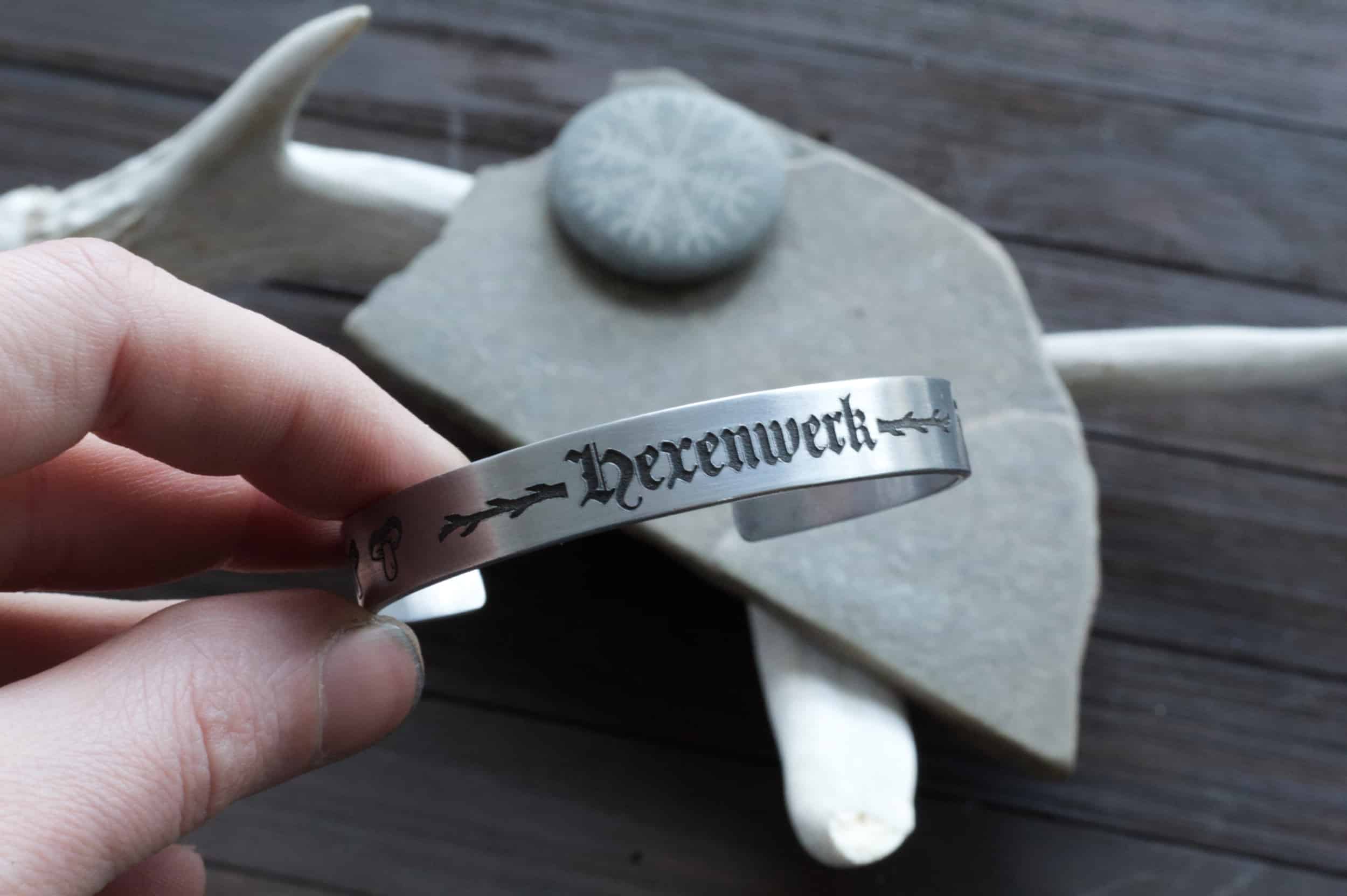 This is the Hexenkreis bracelet, featuring mushrooms on each end and in the very center, embellished with tree branches, is the German word for Witchcraft: HEXENWERK. This bracelet is dripping in deep European shamanic folklore. Crafted entirely by hand in your choice of metal, you can even choose a different word in the center. Please read instructions below on how to customize the text.