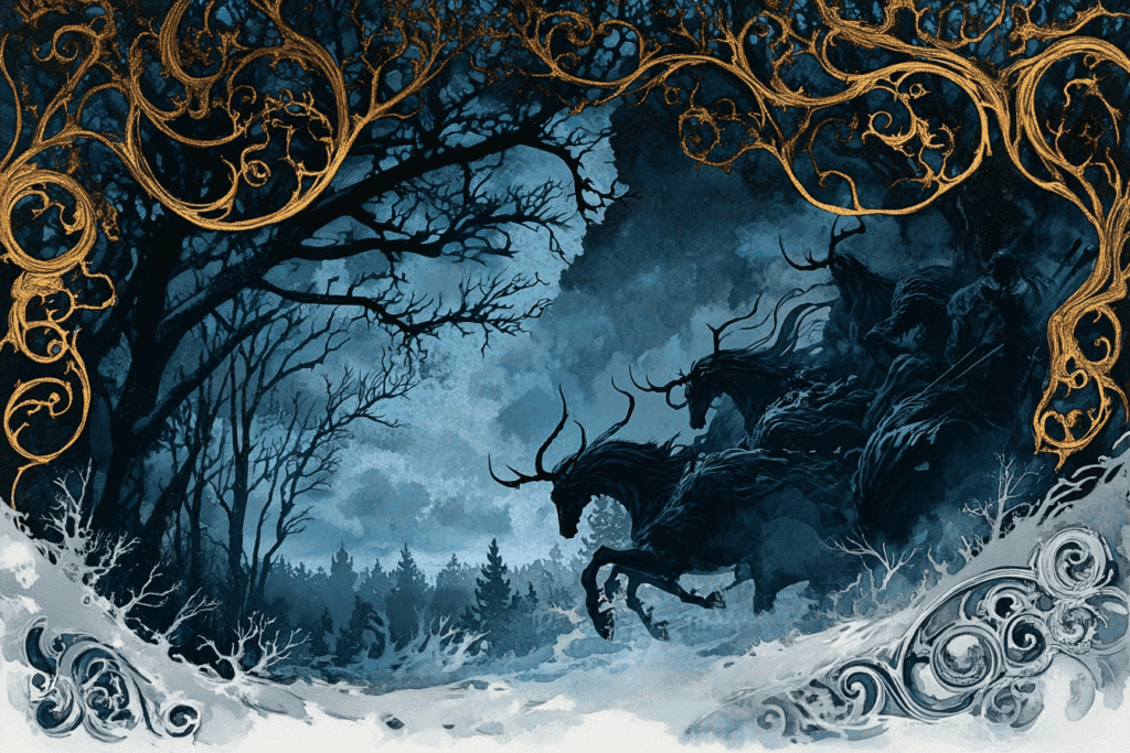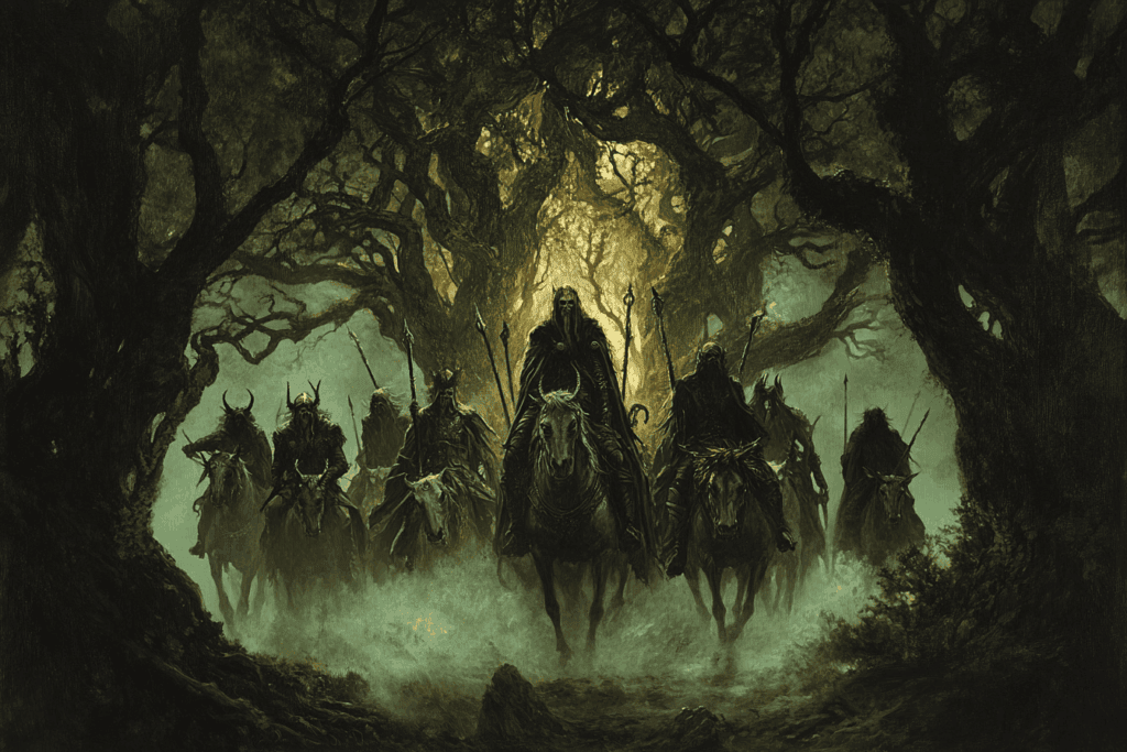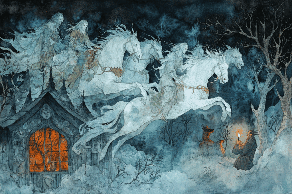It’s a spectral procession of ghostly riders galloping through stormy skies, forest paths, or the borderlands between the living and the dead.